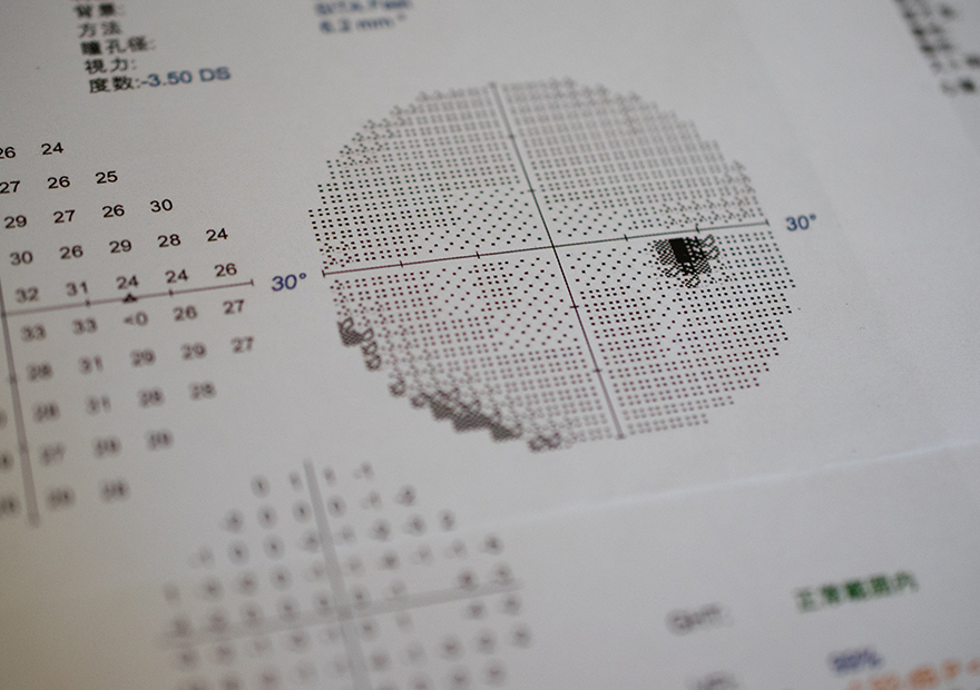 É o exame que avalia a percepção de visão periférica. Anormalidades no campo visual são causadas principalmente por glaucoma, doenças na retina ou neurológicas. Neste exame, o paciente aproxima o rosto do aparelho, que emite pontos de luz de diferentes tamanhos e intensidades. Sempre que o paciente perceber o ponto de luz deve sinalizar apertando um botão. Apesar de o exame depender da colaboração e atenção do paciente, o aparelho possui software que analisa se a quantidade de erros cometidos pelo paciente durante o exame permite confiabilidade no resultado.